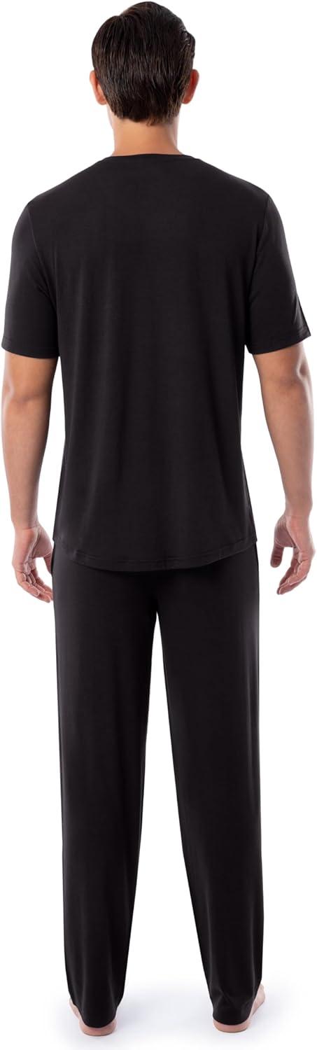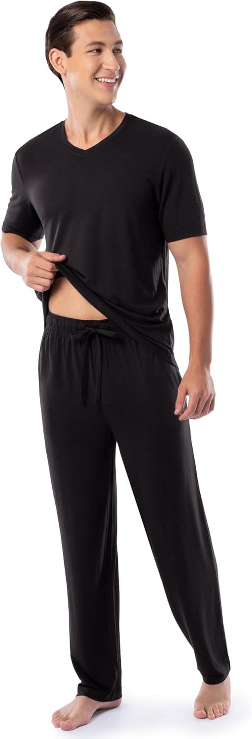 Indulge in relaxation with Fruit of the Loom Men's 360 Stretch Short Sleeve V-Neck Top and Pant Sleep Set. This pajama set combines modernity and timeless comfort. With a relaxed fit, V-neck top, open-bottom pants, and thoughtful details like an adjustable drawstring waistband and side seam pockets, it invites effortless style to your downtime.