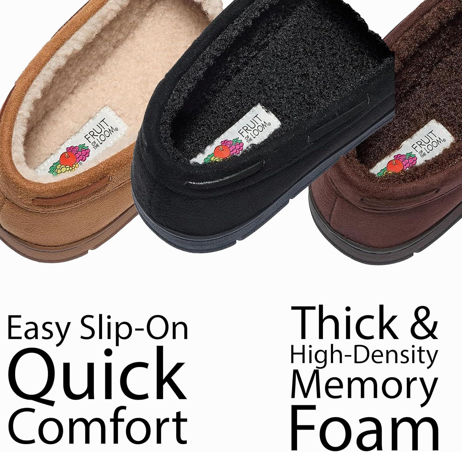 Fruit of the Loom Men’s Moccasin, Indoor/Outdoor Slipper, Memory Foam, Sherpa Lined, Large, Brown(Black)