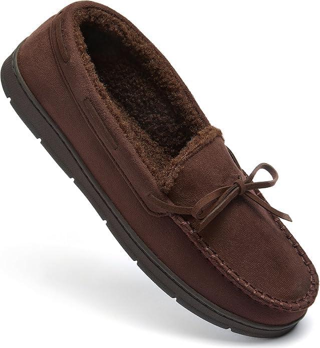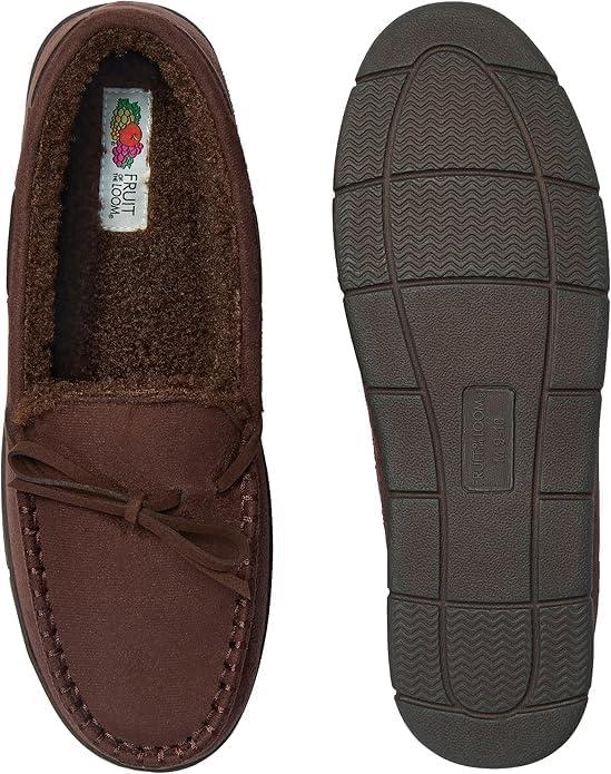 Fruit of the Loom Men's Moccasin, Indoor/Outdoor Slipper, Memory Foam, Sherpa Lined, Large, Brown(Brown)