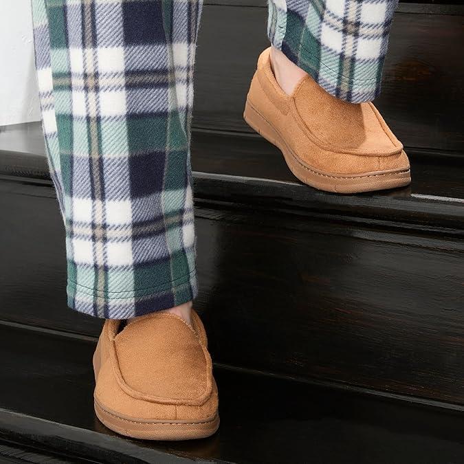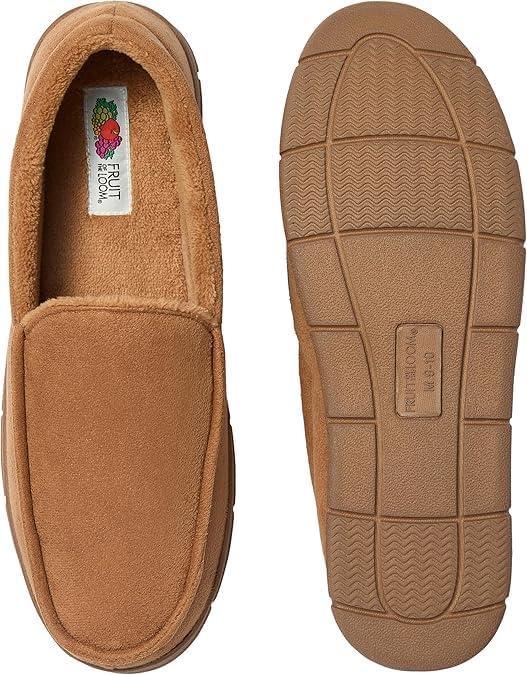 Fruit of the Loom Men’s Moccasin Slippers – Memory Foam Indoor Outdoor House Shoes, Cozy Fuzzy Footwear for Men, Dad, Husband, Christmas Gift, Non-Slip Suede Design(Brown)