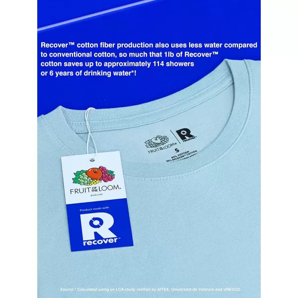 We are committed to a more Fruitful Future. In doing so we are big on turning things into other things! So, we partnered with Recover™ to create our Fruit of the Loom Recover™ Cotton T-shirt. This T-shirt is made with 20% Recover™ cotton, a high-quality, low-impact recycled fiber made from cotton textile waste. Recover™ cotton fiber production also uses less water compared to conventional cotton, so much that 1lb of Recover™ cotton saves up to approximately 114 showers or 6 years of drinking water*! This unisex cotton t-shirt provides more than just saving Earth – it’s made to last with double-needle stitching for extra re-enforcement. The shoulder-to-shoulder cover seam tape ensures your comfort. This sustainable t-shirt is a must-have for your drawer and as always, we provide the best fit, guaranteed! * Calculated using an LCA study verified by AITEX, Universitat de Valencia and UNESCO.