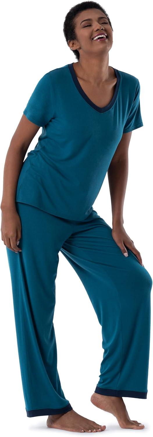 Stay comfy and cool in this Fruit of the Loom ladies short sleeve tee and full length pant 2 piece set that will have you ready to relax and unwind. Made of a super soft and breathable jersey knit fabric, this sleepwear set will have you drifting off to sleep in no time. This women's sleepwear set includes a v-neckline short sleeve tee and a full length pant with an elastic waistband. This 2 piece sleepwear set provides you with that cool and airy feel you desire to have a good nights rest without breaking a sweat. Wake up feeling restored and comfy in lightweight, relaxed fit, and breathable sleepwear from Fruit of the Loom.