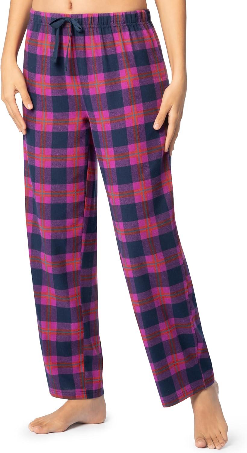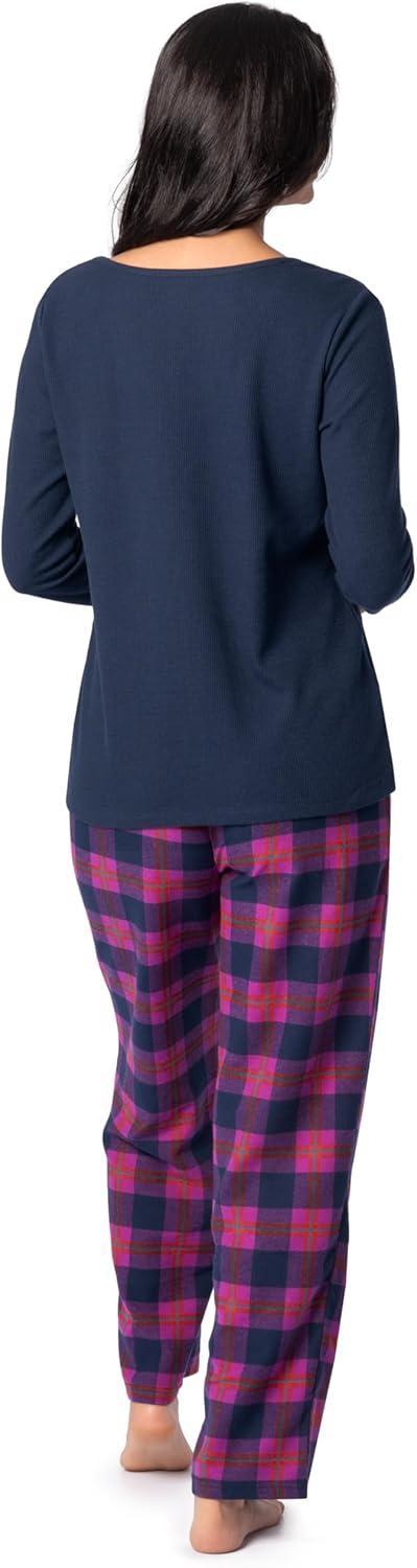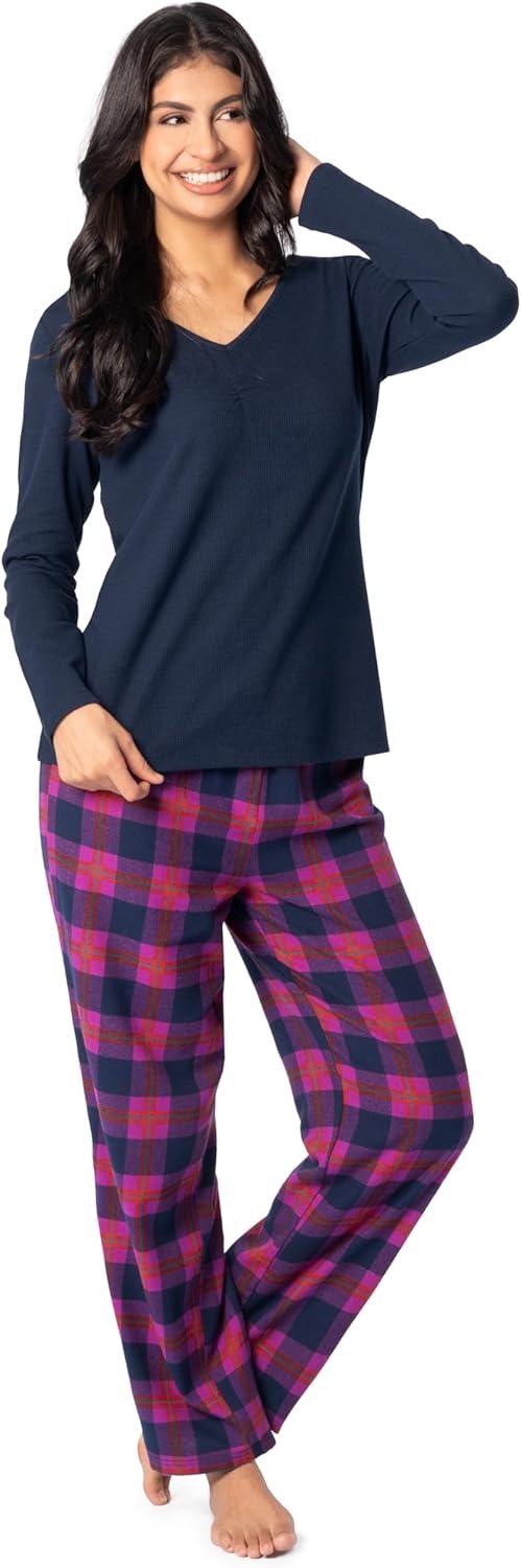 Fruit of the Loom Women’s Waffle V-Neck Top and Flannel Pant Sleep Set(Navy/Pink Plaid)